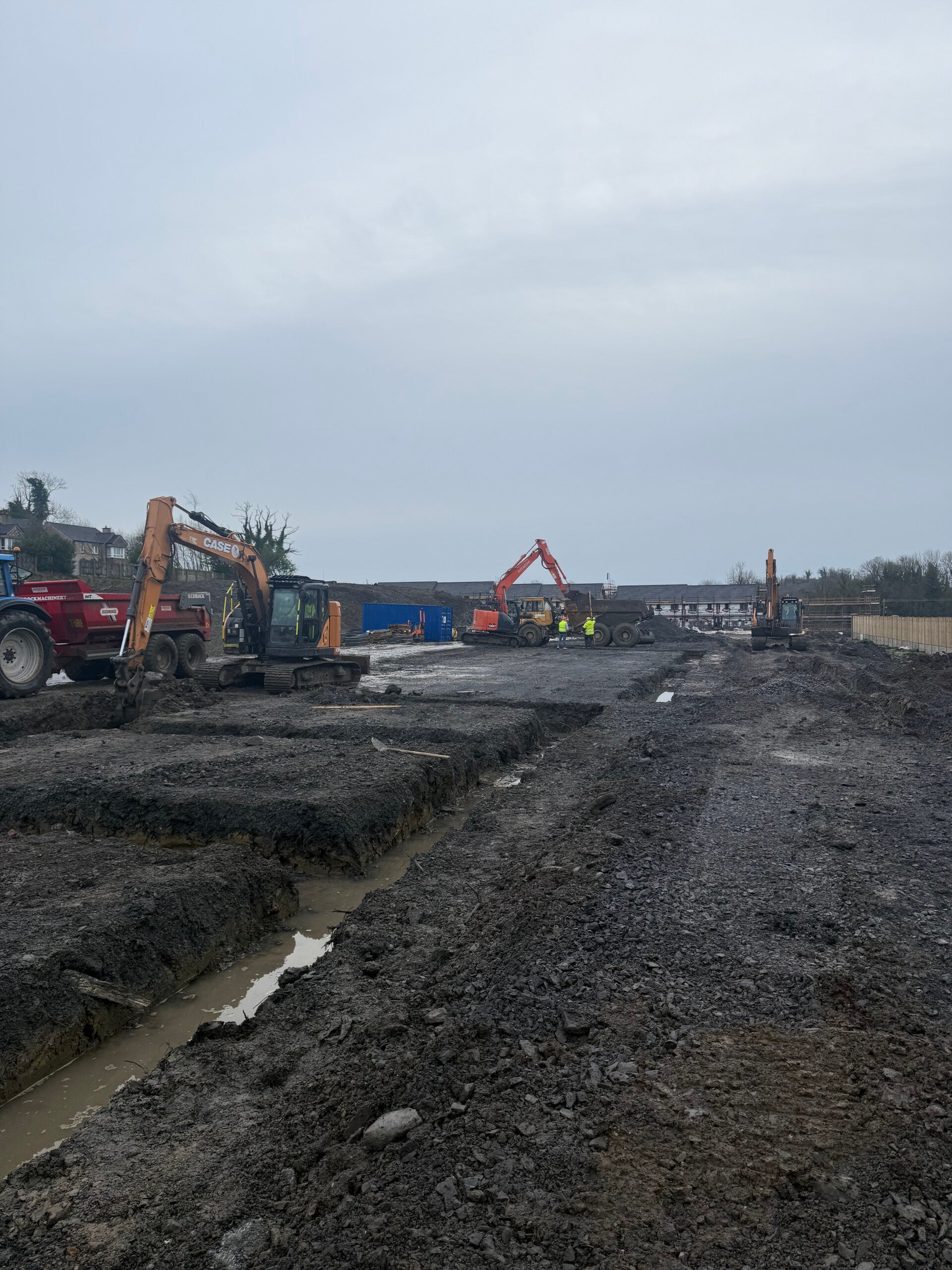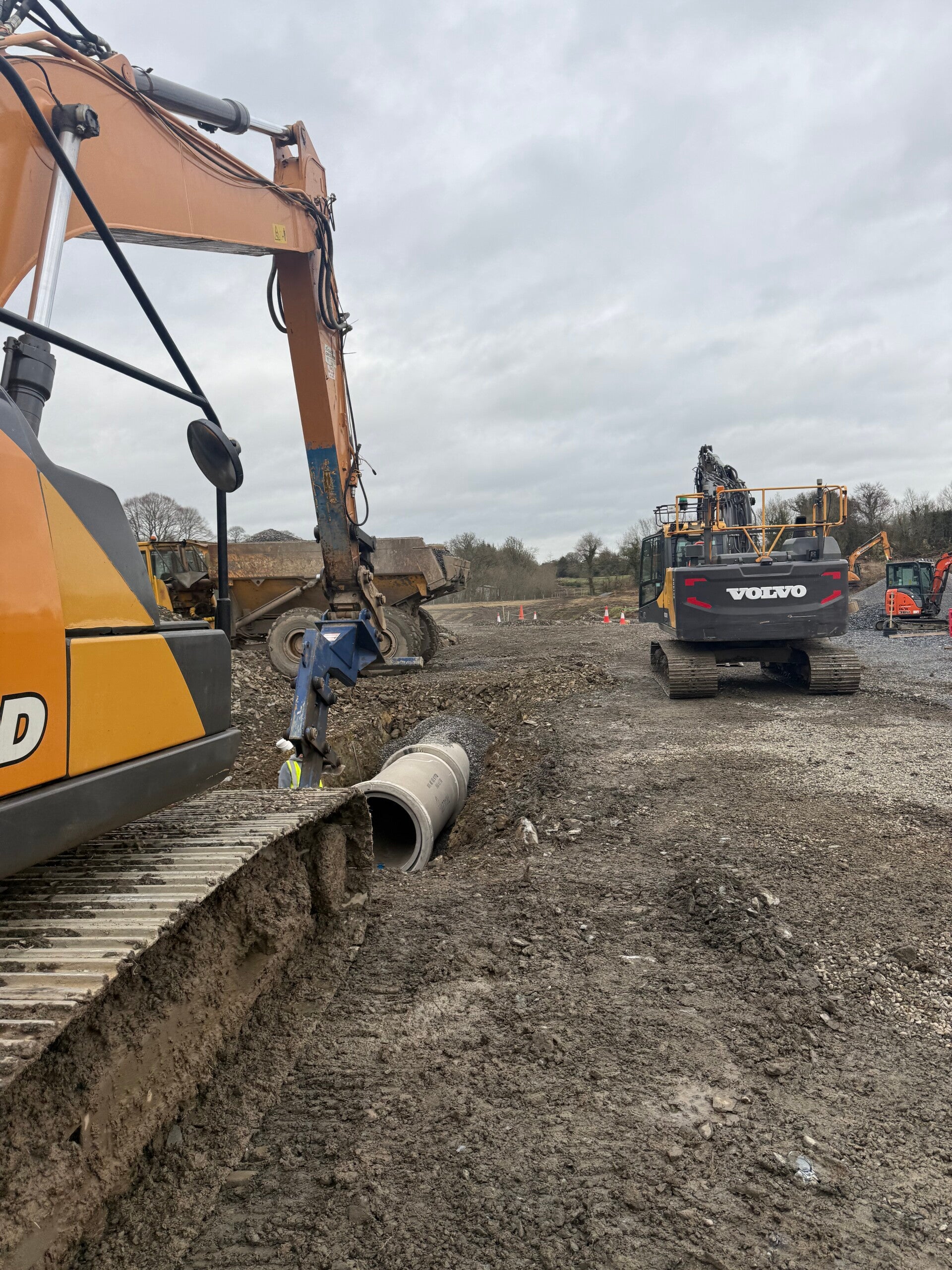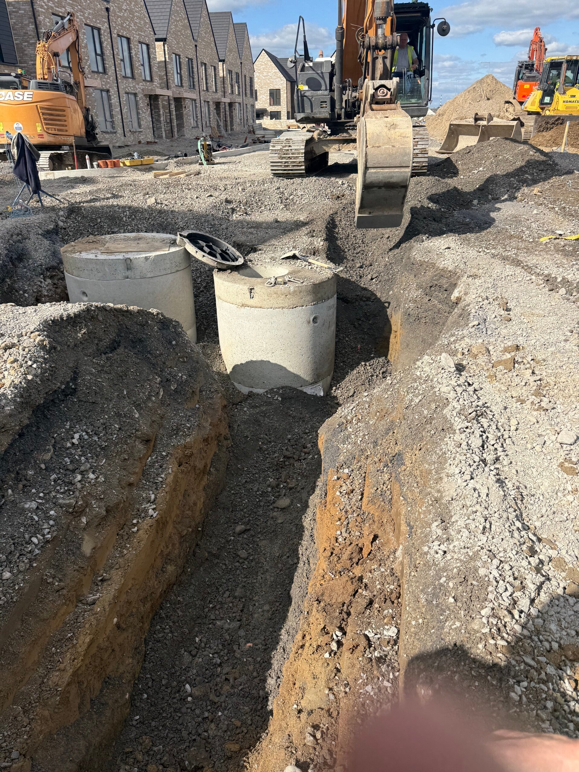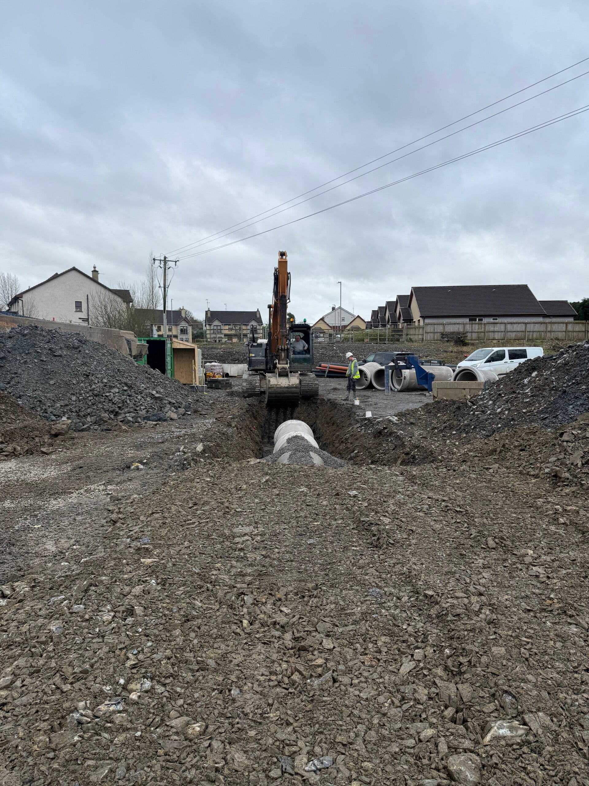Our standout projects are large residential schemes where we have successfully delivered deep drainage and mainline infrastructure, foul and storm networks, watermains and ducting, raft foundations, footings, concrete works, paving, kerbing, culverts and associated civil works. With experienced site teams, our own plant fleet, in-house QS and safety support, we are equipped to deliver both specialist packages and full groundworks contracts to a high standard — on programme, efficiently managed and with a practical, site-led approach.