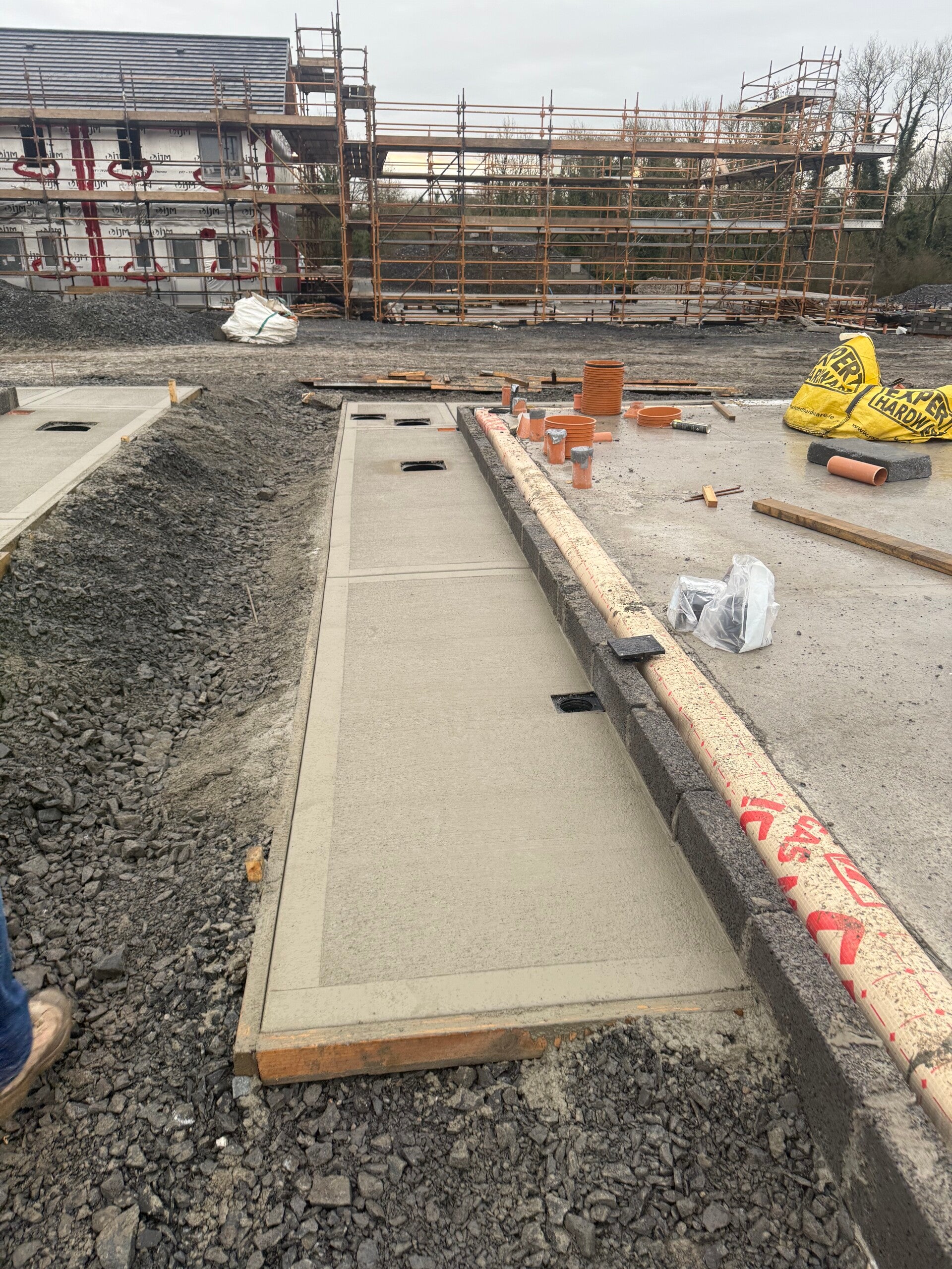 P Kiernan Groundworks delivers groundworks and civil engineering packages across residential and commercial developments. Our work includes deep drainage, services, watermains, foundations, concrete works, roads, footpaths, kerbing and full site development.